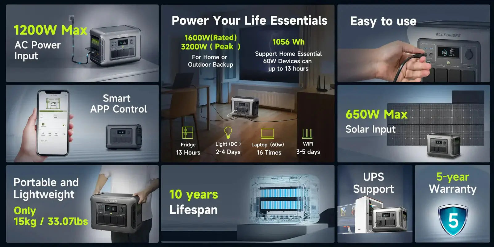 R1500 LITE оснащений чудовою літієво-залізною фосфатною батареєю. Через низьку енергетичну щільність вона важча за трикомпонентні літій-іонні батареї, але має чудові цикли роботи. Завдяки нашій ексклюзивній технології кількість циклів роботи ALLPOWERS R1500 LITE перевищує 3500. Навіть при щоденному використанні вона прослужить приблизно 10 років або більше.