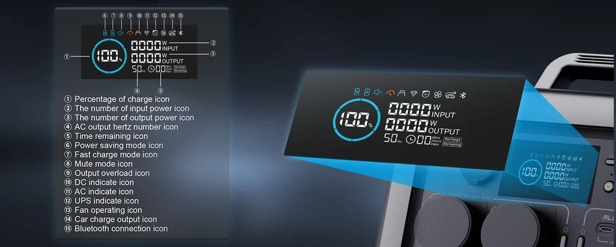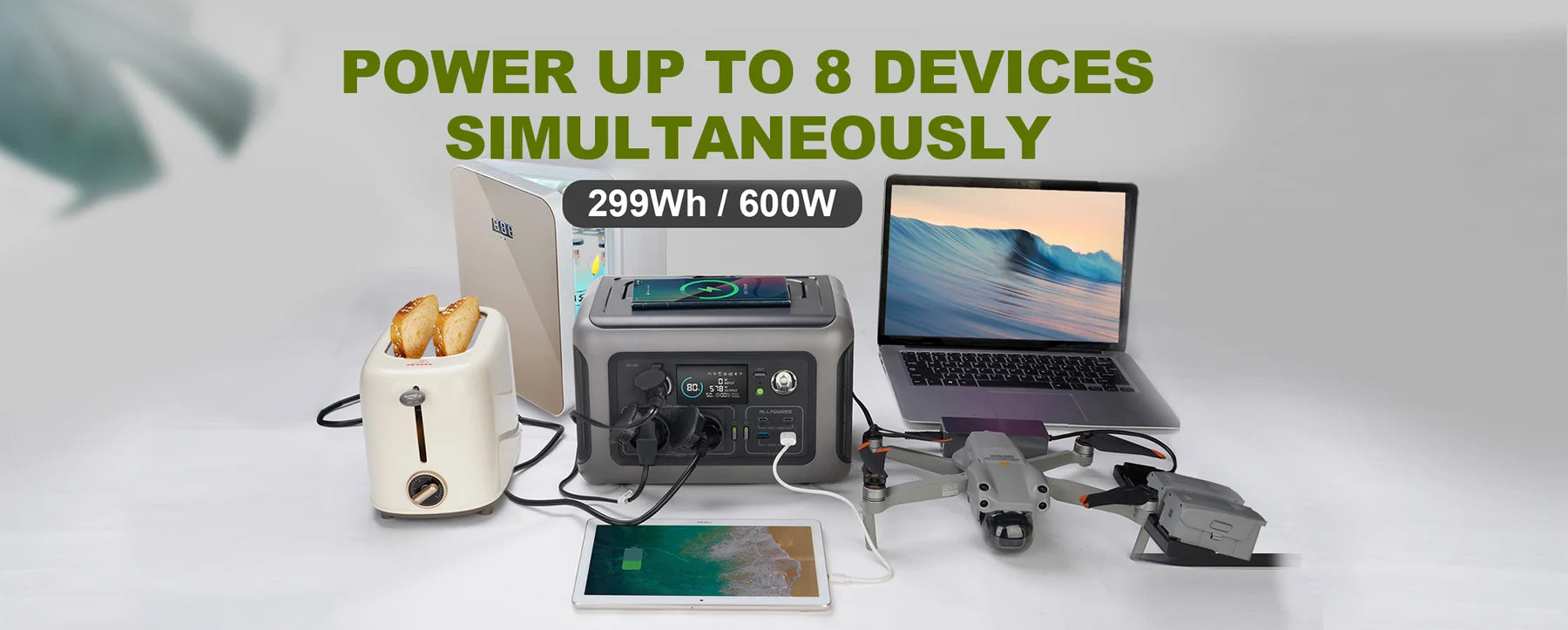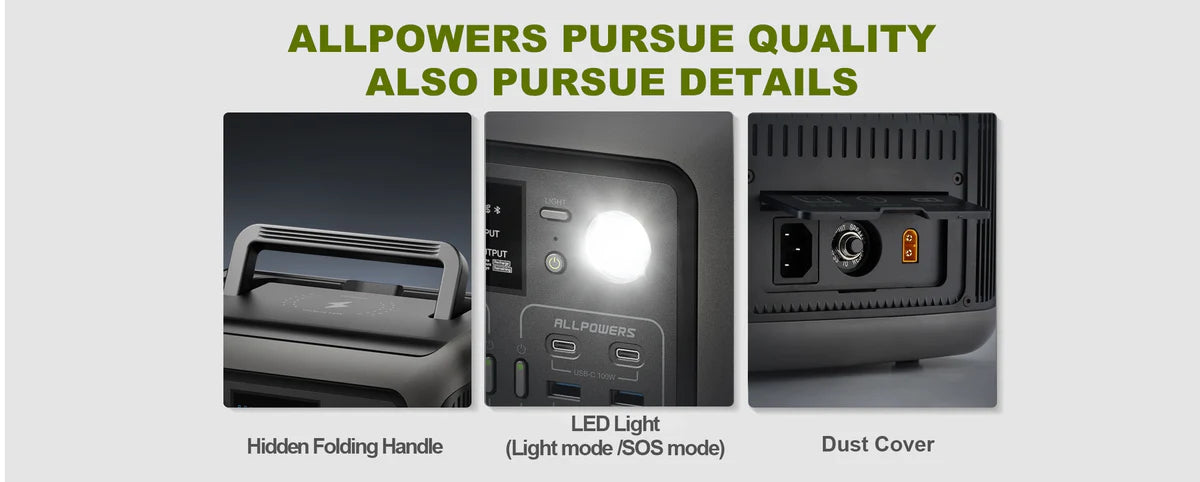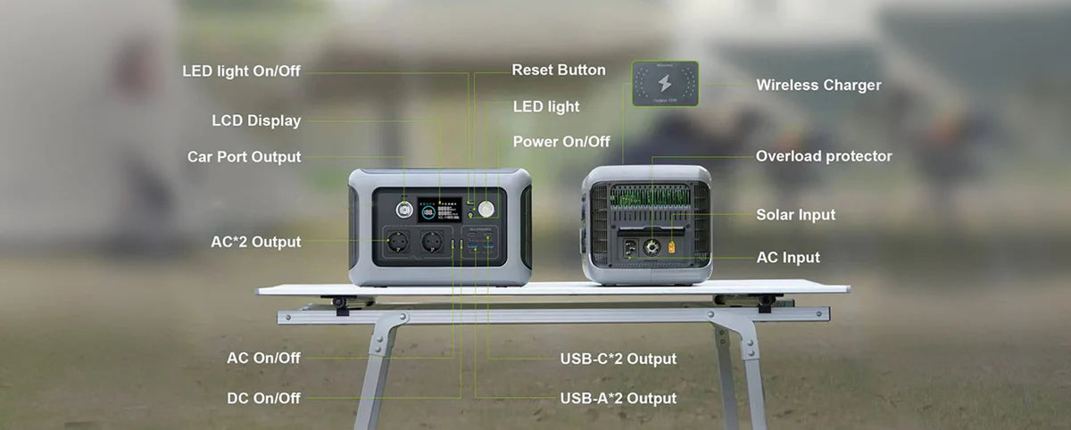 Портативна електростанція ALLPOWERS має 2 розетки змінного струму (220 В-240 В 600 Вт, 1200 Вт пікова потужність), 2 порти USB-C, 2 порти USB-A, 1 автомобільний прикурювач (12 В/10 А) і бездротовий зарядний пристрій потужністю 15 Вт. З потужністю до 600 Вт, зовнішній генератор ALLPOWERS R600 спеціально розроблений для заряджання чайників, соковижималок, ноутбуків, автомобільних холодильників, дронів та інших зовнішніх електронних пристроїв, забезпечуючи безтурботне живлення ваших пригод на свіжому повітрі.