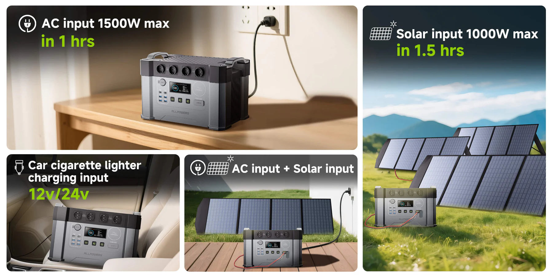 • Заряд від 0 до 100% за 1,5 години (AC + сонячний вхід);
