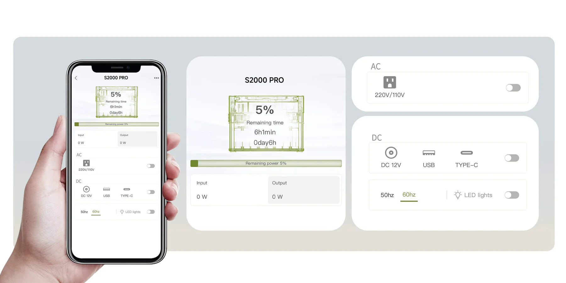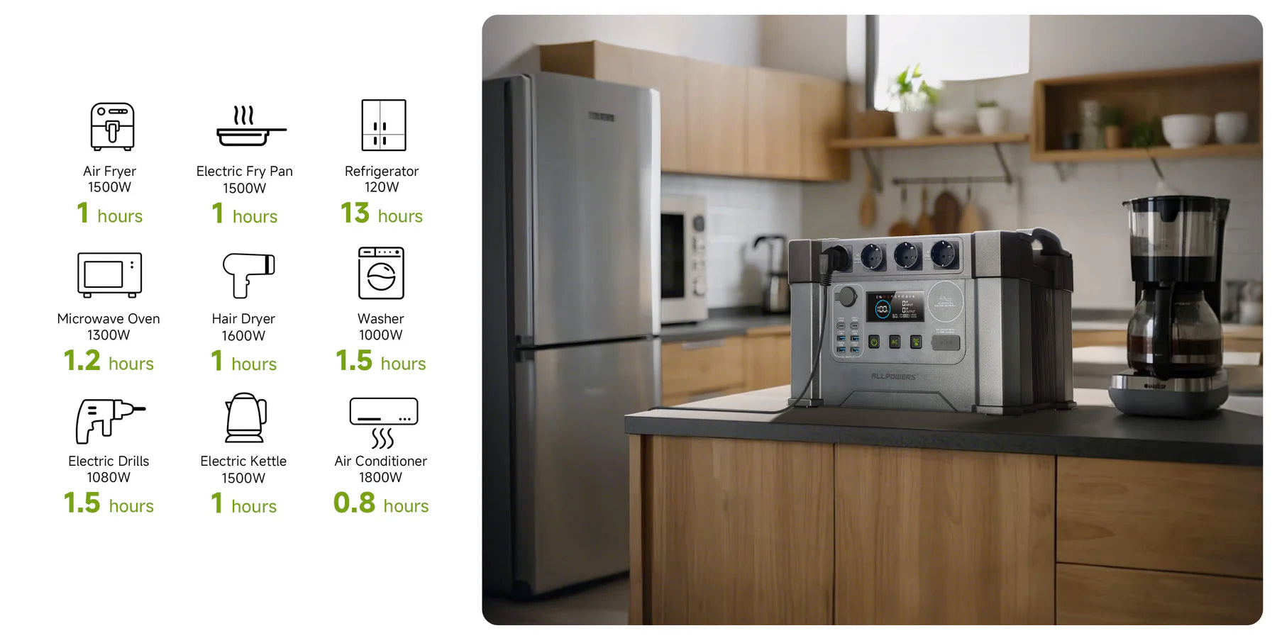 S2000 Pro має вражаючу ємність 1451 Wh і вихідну потужність 2400 W, що дозволяє живити 99% побутових приладів. Ви можете використовувати його для живлення більшості інструментів і пристроїв для активного відпочинку та під час надзвичайних ситуацій вдома, забезпечуючи впевненість у будь-якій ситуації.