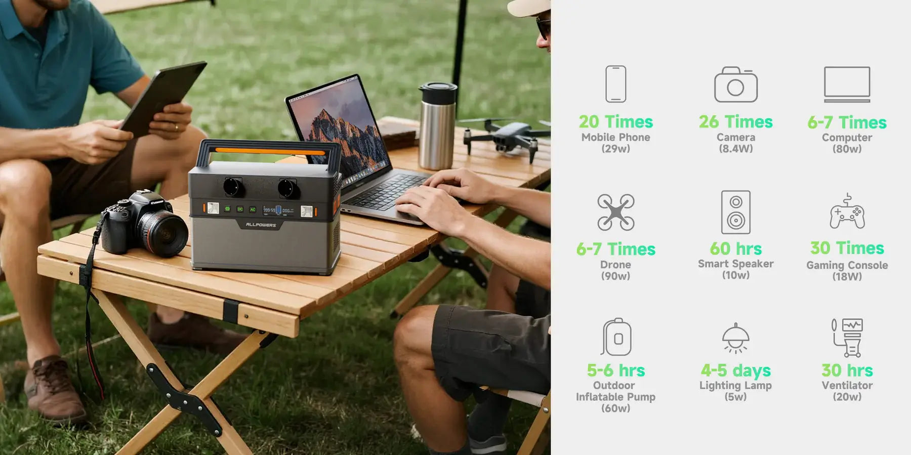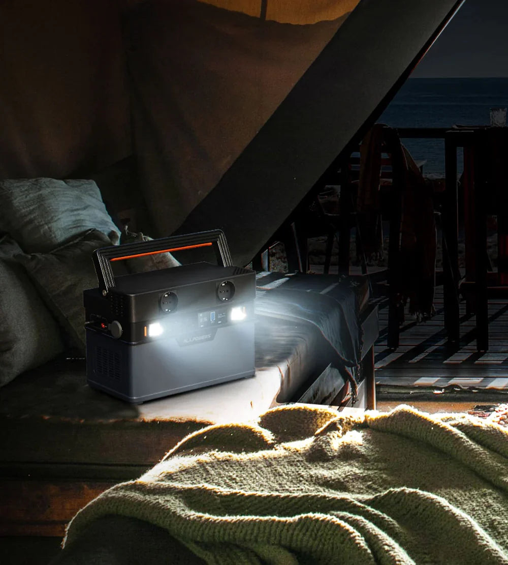 ALLPOWERS S700 — це акумуляторна електростанція, що вміщує 604 Вт·год у легкому корпусі вагою 11,6 фунтів/5,3 кг. Компактний розмір і ручка для перенесення роблять її справді портативною для кемпінгу. Завдяки великій ємності 604 Вт·год і більшій номінальній потужності 700 Вт, вона готова забезпечувати живлення для багатьох приладів: міні-холодильника, вентилятора, проєктора, лампи та телевізора протягом тривалого часу. Вбудована лампа може використовуватися як аварійне освітлення.