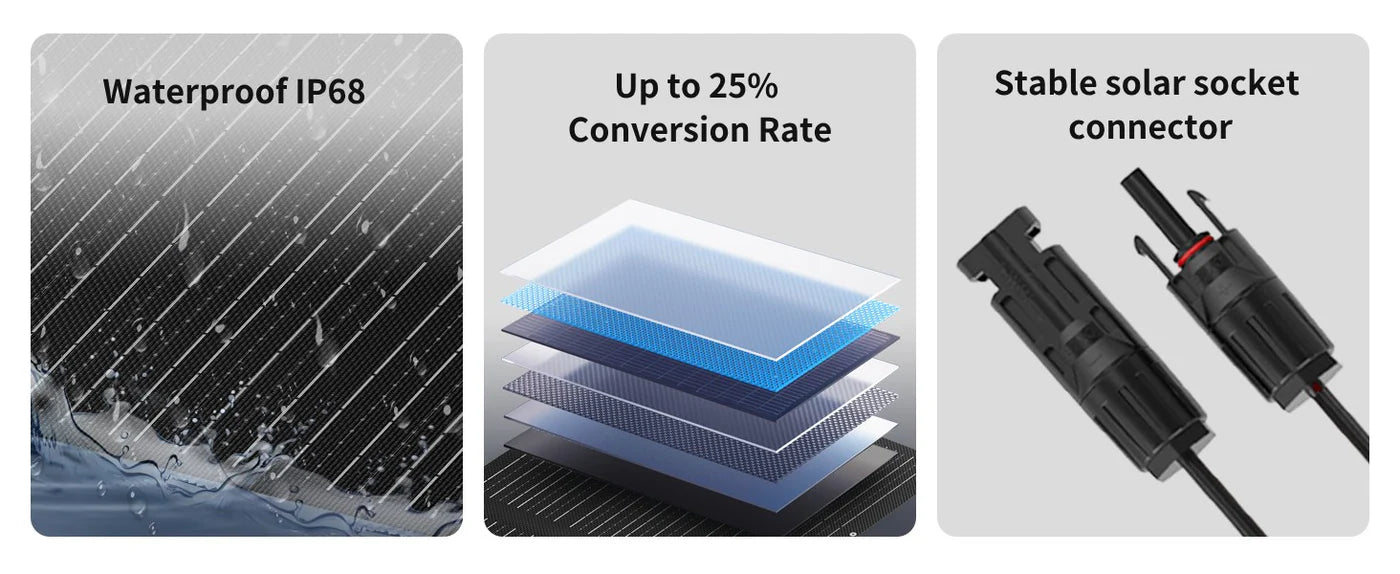 Його водонепроникний сертифікація IP68 – це найвищий рівень захисту, що забезпечує стабільну роботу навіть за несприятливих погодних умов. Його провідний у галузі коефіцієнт перетворення енергії 25% значно покращує швидкість заряджання та фіксує більше енергії. Його надійний роз'єм для сонячної панелі забезпечує безпроблемну передачу енергії. Роз'єми професійного класу стійкі до падінь, іскор, безпечні та стабільні.