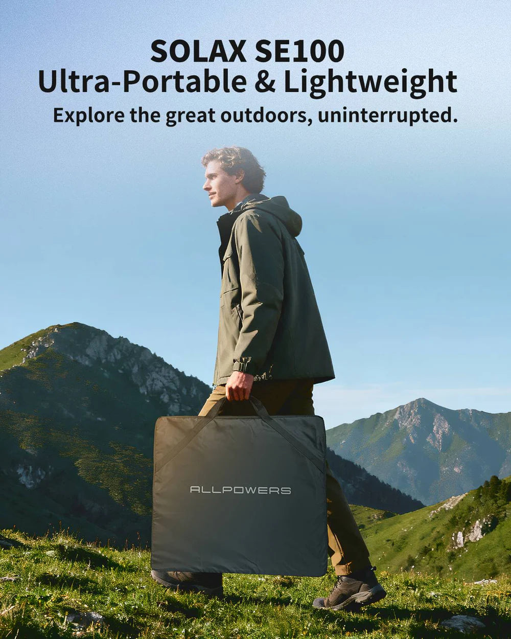 ALLPOWERS SOLAX SE100 — це високоефективна портативна сонячна панель потужністю 100 Вт, розроблена для універсальності та надійного автономного живлення. Її міцна, складна конструкція інтегрує монокристалічні елементи з високою конверсією. Швидко заряджає електростанції, генератори та 12-вольтові акумулятори через вбудований роз'єм промислового класу. Ідеально підходить для кемпінгу, подорожей на автофургонах або аварійного резервного копіювання, вона має зручну підставку для оптимального вирівнювання по сонцю. Міцна, водонепроникна конструкція забезпечує роботу в різних умовах, що робить її незамінним інструментом для сталого енергопостачання в дорозі.